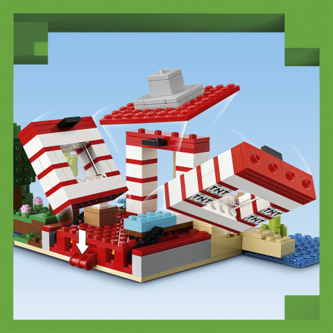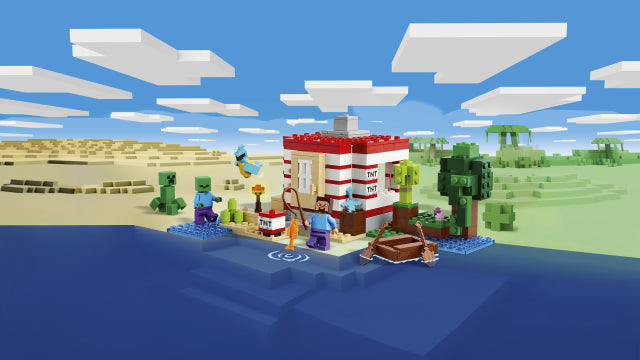 • Explosiv LEGO® Minecraft® äventyrsleksak – Barn kan trycka på en knapp för att utlösa en explosion som får husets tak och väggar att rasa