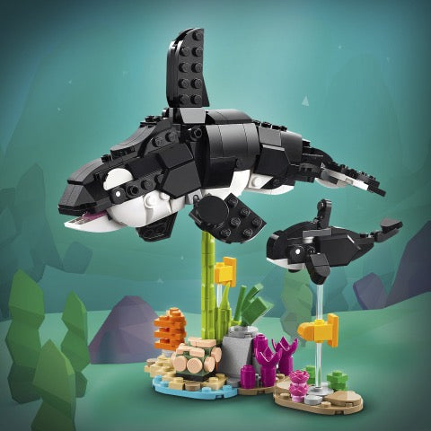 • Modeller för lek och uppvisning – När lekstunden är över kan LEGO® djurfigurerna ställas på en hylla eller på nattduksbordet, med 2 genomskinliga ställ för att visa upp späckhuggarfamiljen