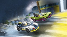 • Vad finns i byggsetet? – Allt barn behöver för att bygga ett insatsfordon och en muskelbil för flykt, plus en polis- och en skurkminifigur för roliga rollekar