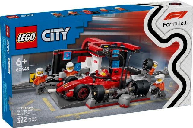 • Vad finns i lådan? – Allt barn behöver för att bygga ett F1® depåstopp och en leksaksbil från Ferrari, plus minifigurer av en förare och 4 depåarbetare