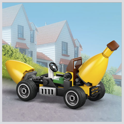 • Roliga tillbehör – Daves skivstång, den hemliga AVL-agenten Tims bärbara röntgenglasögon och helikopterhatt, depåminionen Rons blö = jpistol, en banan och en LEGO® målning av en banan