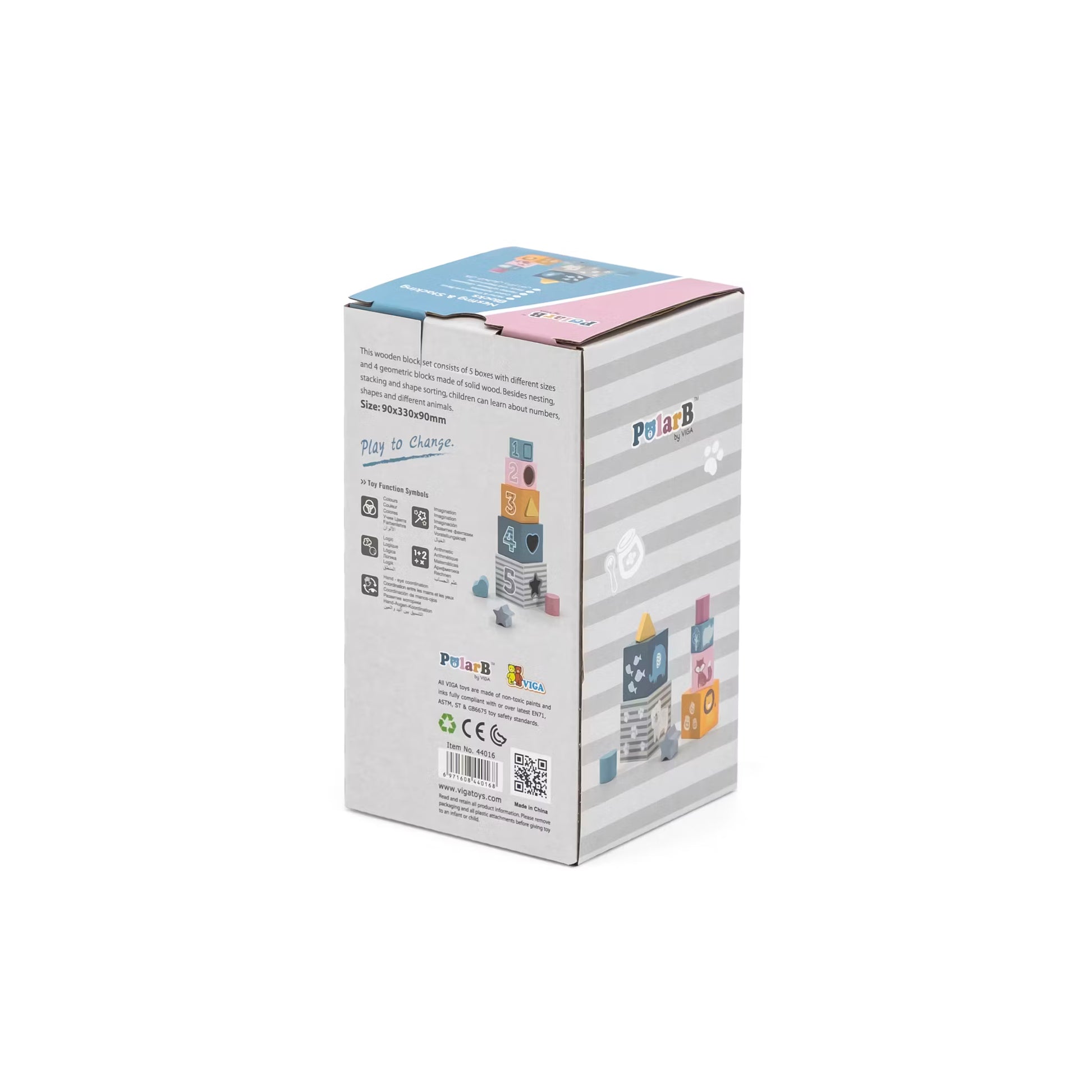 Stapelbar kub med 5 kuber. Kuben högst upp innehåller en skallra de andra 4 har hål i sig med tillhörande klossar som barnen kan lägga i.CE, REACH, EN71 1,2,39x 9x9x32