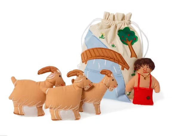 Fina fingerfigurer från Oskar & Ellen som hjälper till i berättandet om den klassiska norska folksagan om de tre bockarna Bruse. Bockarna är på väg till en
